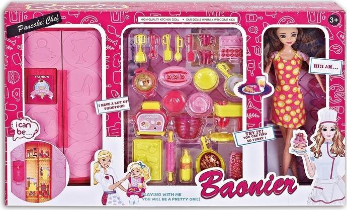 Lalka o wielkości ok. 30 cm. W zestawie znajdują się również dodatkowe akcesoria tj.: lodówka, toster, garnek, patelnia, wałek, kubki, jajka, zestaw sztućców, mikser.