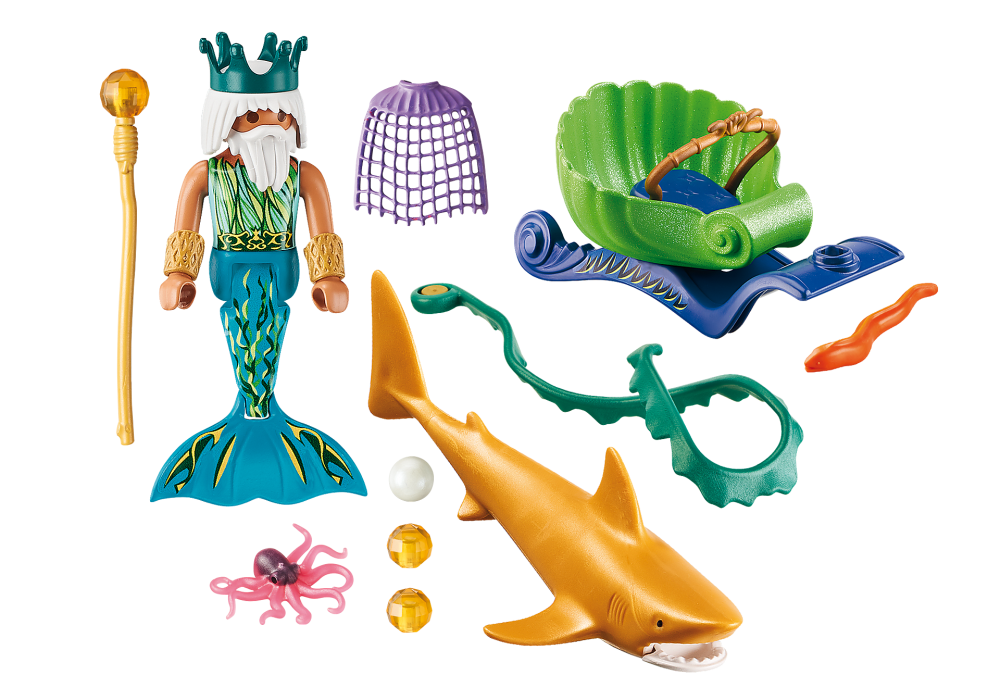 Dumny król mórz PLAYMOBIL rządzi swoimi poddanymi. A rekin ciągnie jego powóz przepływając przez ocean. Tymczasem mieszkańcy szukają koralików światła, aby morze nie pogrążyło się w ciemności. Dostawa obejmuje króla morskiego z koroną, powóz z małżami, rekina, perły i inne akcesoria. Mała ośmiornica zmienia kolor nawet w ciepłej wodzie!