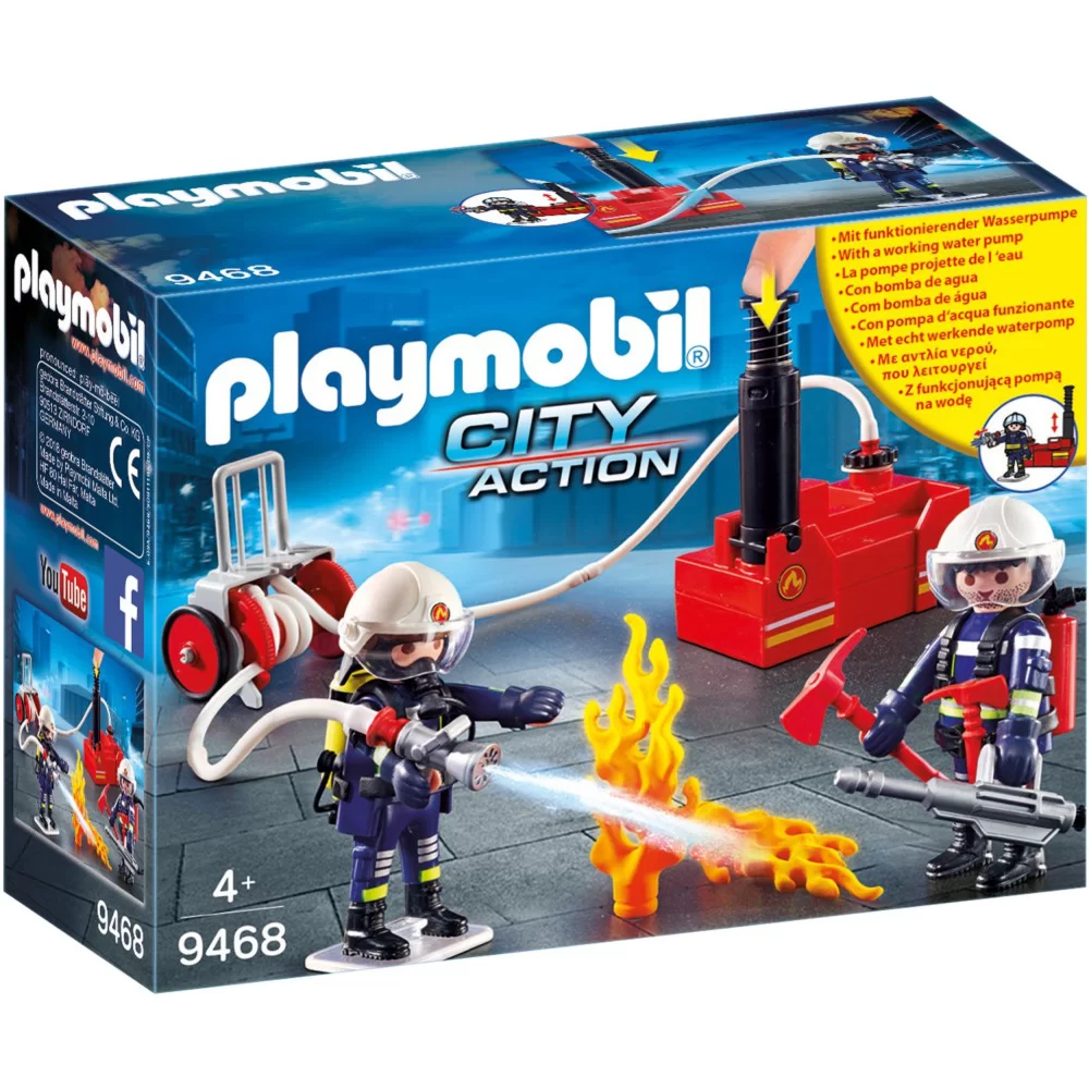 Strażacy z gaśnicą 9468. Żadna akacja ratownicza nie stanowi problemu dla doświadczonych ekspertów straży pożarnej Playmobil. Strażak zakłada kask, chwyta w rękę topór i rusza na ratunek z najnowszym sprzętem w remizie. Funkcjonująca pompa wodna może być napełniana wodą i obsługiwana przez naciśnięcie pompy. Zestaw stanowi wspaniałe uzupełnienie dla zestawów Playmobil 9463, 9464, 9466 (sprzedawane oddzielnie w zależności od dostępności), ale świetnie nadaje się również do zabawy z pominięciem innych zestawów.